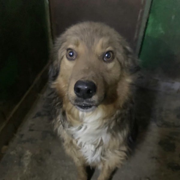Dieser Hund lebt in einem gemischten Rudel im Kennel zusammen.