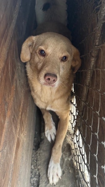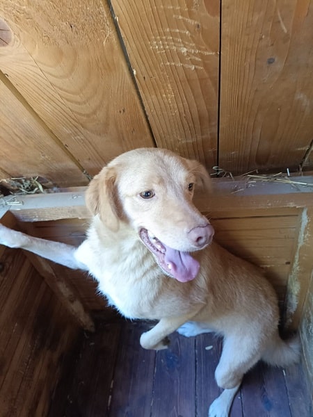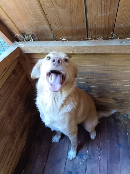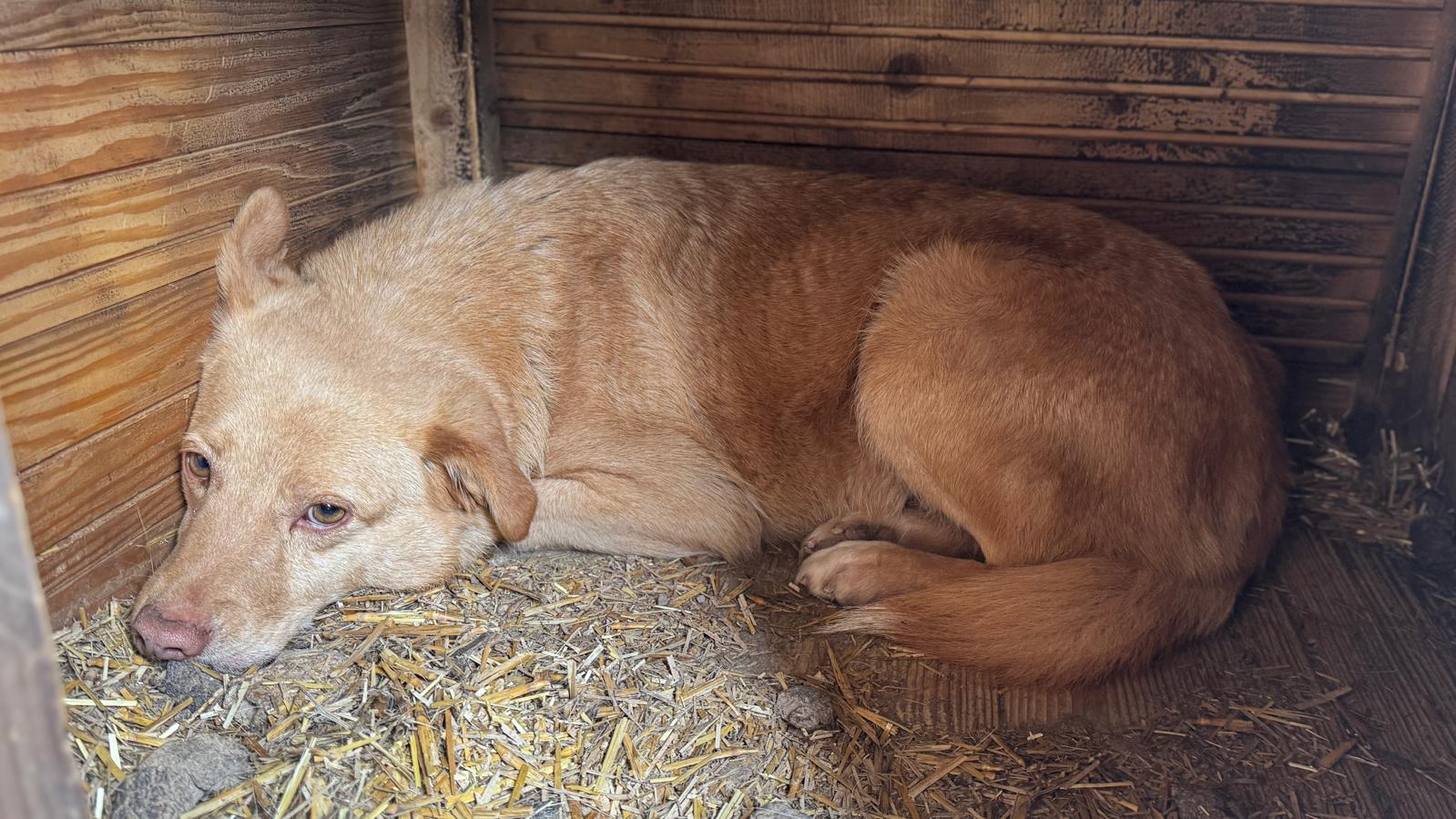 POPCORN ist leider weiterhin sehr unsicher und lag bei unserem Besuch in der Hütte. Er nahm keine Leckerlies von uns an, aber unter Bedrängung konnten wir ihn vorsichtig anfassen. POPCORN beschwichtigte dabei und machte deutlich, dass es ihm unangenehm war und er es sehr wahrscheinlich einfach nicht kennt, angefasst zu werden.
