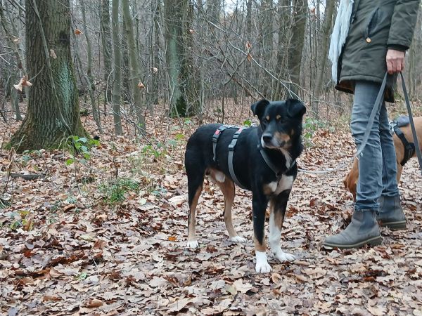 Draußen ist er gut leinführig. Er ist kein Leinenpöbler und zeigt bisher auch keinen ausgeprägten Jagdtrieb. Auf Spaziergängen in der Stadt ist er souverän unterwegs und zeigt keine Unsicherheiten. Er muss nicht unbedingt ländlich wohnen.