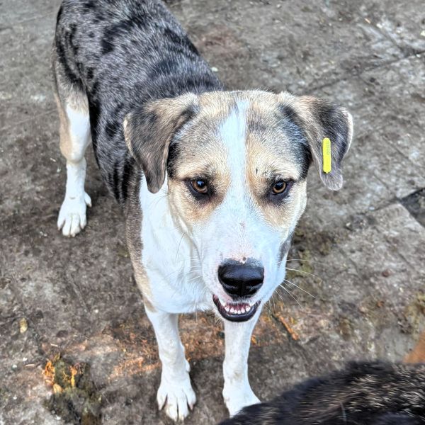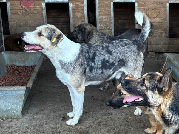 Dieser wunderhübsche Bub mit der tollen Fellzeichnung ist neu im Shelter und freute sich über die seltene Abwechslung, die unser Besuch bot. X zeigte sich von der ersten Sekunde an aufgeschlossen und freundlich, suchte nach wenigen Momenten unsere Nähe und ließ sich gern streicheln. Wir merkten ihm an, dass er sich nach Zuwendung und Beschäftigung sehnt. Die große, gemischte Gruppe ist neu zusammengesetzt und scheint generell harmonisch. X und ein weiterer junger, großer Rüde sind die beiden „Draufgänger“ des Kennels und diskutierten auch mal, blieben jedoch stets freundlich. Nachdem sich die allgemeine Aufregung etwas gelegt hatte, lagen alle Hunde entspannt im Kennel verteilt. Wir wünschen dem lieben X, dass er rasch gesehen wird und diesen trostlosen Ort hinter sich lassen darf. Er sehnt sich nach mehr, möchte dazugehören und noch so viel erleben.