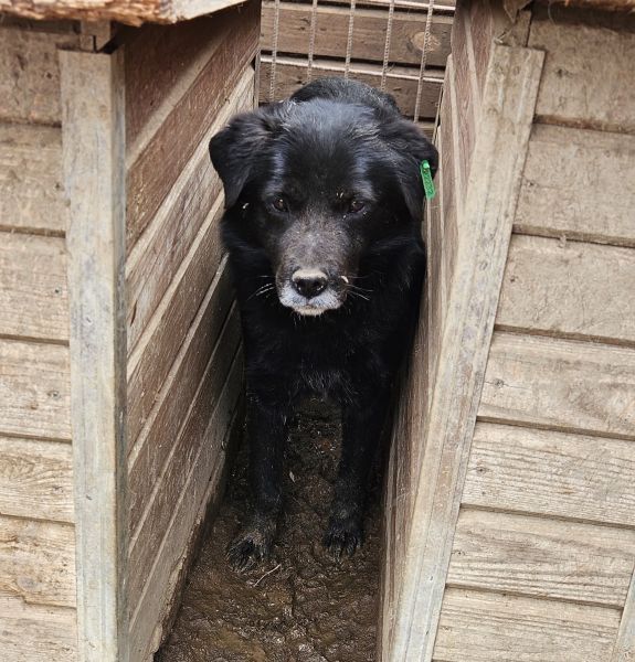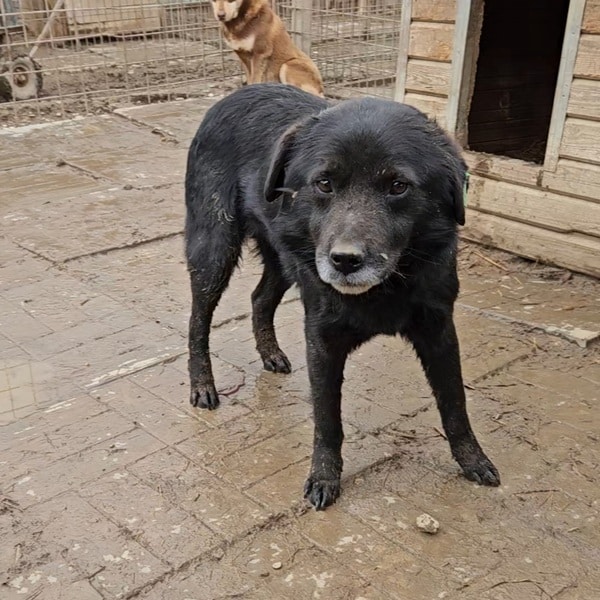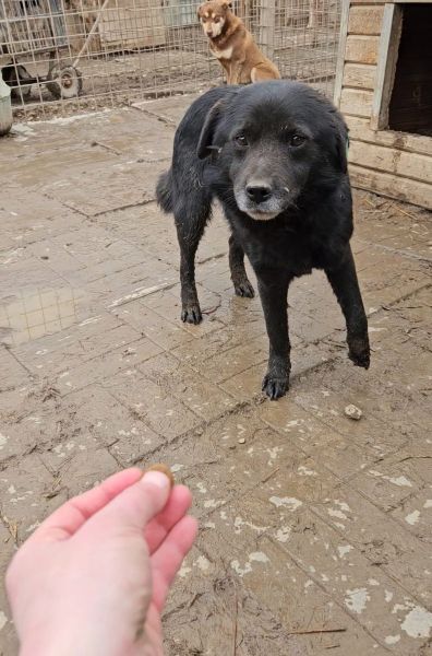 Dieser hübsche schwarze Rüde hielt sich während unseres Besuches hauptsächlich hinter einer Hütte auf. Vor Betreten des Kennels mussten wir einen unfreundlichen Hund aus dem Kennel holen lassen. Diese Situation und natürlich auch die allgemeine Situation im Shelter waren nicht angenehm. Anfangs lag er direkt bei einem Rüden, den wir auch berühren konnten. Während wir uns mit dem anderen Hund beschäftigten, blieb er einfach liegen und schaute zu. Offensichtlich beschloss auch er dann allen Mut zusammen zu nehmen und fragte ganz lieb nach einem Leckerchen, dieses nahm er uns auch direkt aus der Hand ab. Nach kurzer Zeit konnte wir ihn am Kopf streicheln. Ganz so schlecht fand er unsere Zuwendung auf jeden Fall nicht. In liebevoller Umgebung wird er kleine Kerl schnell auftauen und seinen Menschen viel Freude bereiten. In seinem Kennel mit 9 weiteren Hunden ist er gut verträglich. Er würde auch zukünftig von Hundegesellschaft in seinem Zuhause profitieren, da er sich stark an den Reaktionen der anderen Hunde orientierte. Wir hoffen, dass der hübsche schwarze Hundemann schnell von den richtigen Menschen gesehen wird, die ihm zeigen, wie es sich anfühlt wirklich geliebt zu werden.