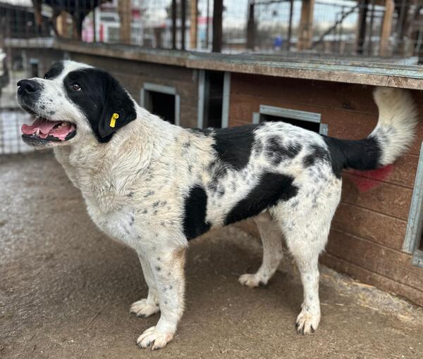 – Er soll bereits 7 Jahre alt sein, aber dafür sportlich (springt mit Leichtigkeit auf die Hundehütte und spielte freudig um uns herum)