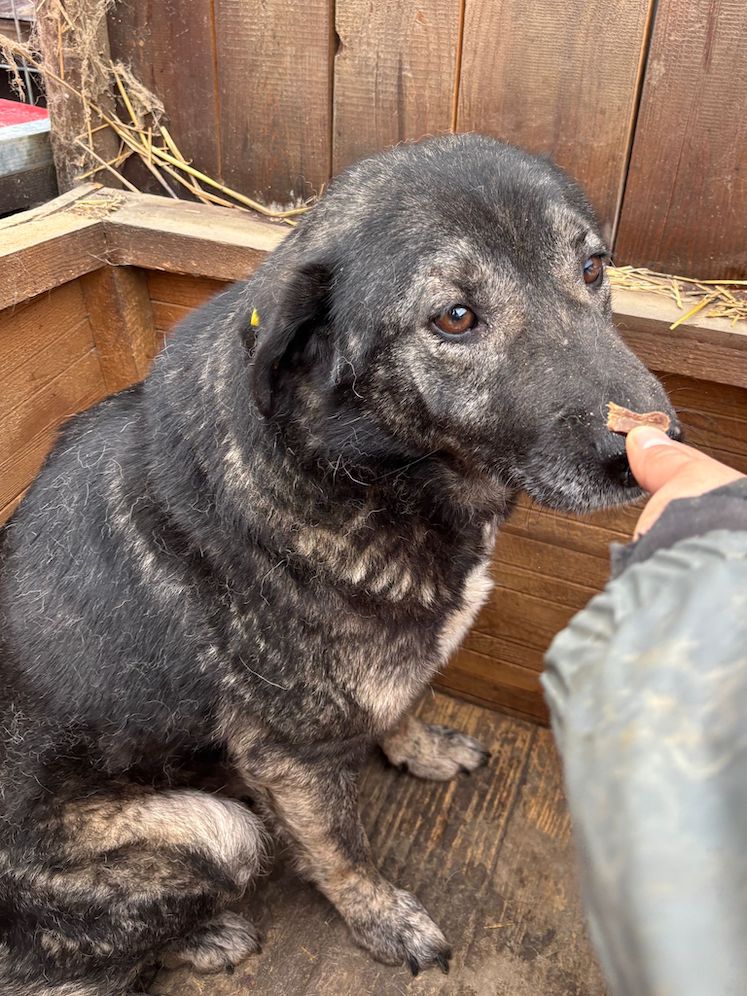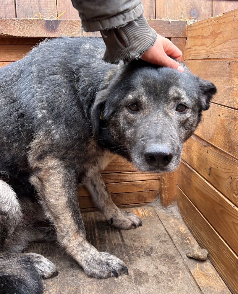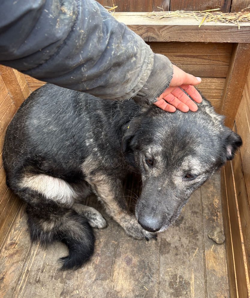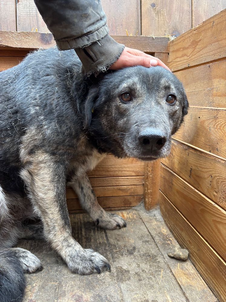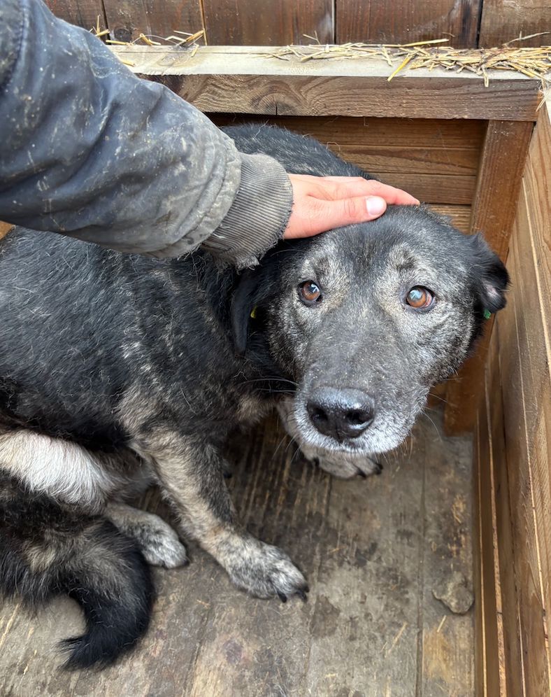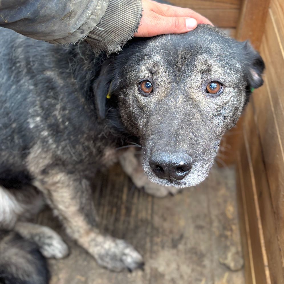 Dieser süße Rüde lag während unseres Besuchs zunächst in seiner Hütte. Als wir uns ihm darin zuwandten, blickte X uns mit großen Augen an. Wir konnten ihn gut streicheln, doch ganz geheuer war ihm diese intensive Nähe nicht. Den Kontakt zu uns Menschen wir er womöglich einfach nicht kennen. Er machte es jedoch ganz fein mit und zeigte keinerlei Abwehr. Wir wünschen dem sensiblen X, dem der Stress im Shelter sichtlich zu schaffen macht, dass er schon bald von verständigen Menschen gesehen wird. Damit er Stück für Stück an ein Zusammenleben auf der Sonnenseite herangeführt werden und seine Sorgen vergessen kann. Interaktion mit den anderen Hunden konnten wir nicht beobachten, da X nur in der Hütte saß. Wir schätzen ihn jedoch verträglich ein.