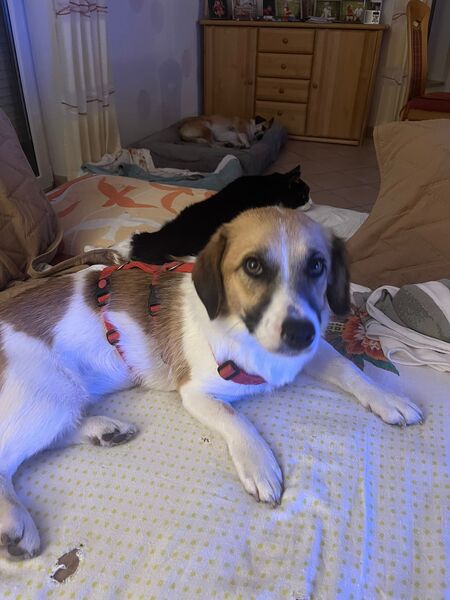 Hier auf unserer Pflegestelle lebt sie mit 2 weiteren größeren Hunden (beiderlei Geschlechts) zusammen und zeigt sich sehr verträglich. Unseren Kater hat sie vom 1. Tag an akzeptiert.