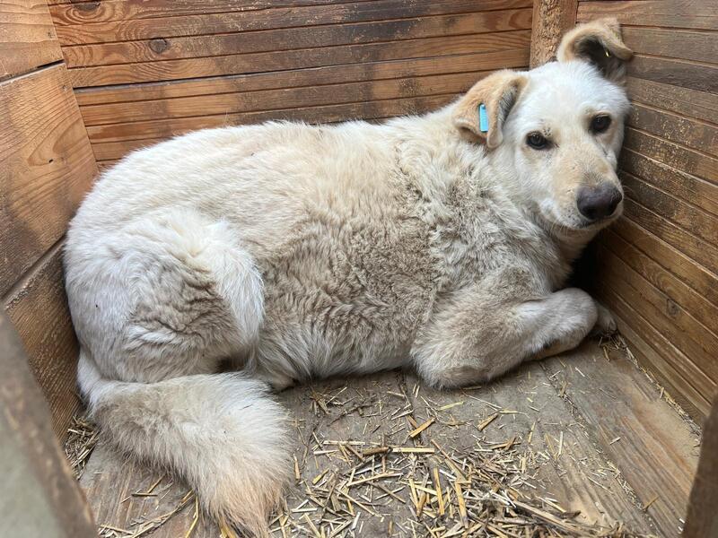 RAZU saß die ganze Zeit in der Hütte. Hier konnten wir ihn gut anfassen. Man merkt, dass er es nicht kennt, aber er zeigte weder Abwehr- noch Fluchtverhalten. Als wir ihn nötigten, die Hütte zu verlassen, suchte er Schutz bei einem Kennelkollegen. RAZU ist wirklich sehr unsicher, aber wir denken, dass er in einer anderen Umgebung und bei sehr erfahrenen Menschen nach Eingewöhnungszeit zutraulicher werden könnte. Ein souveräner Ersthund ist ein Muss.