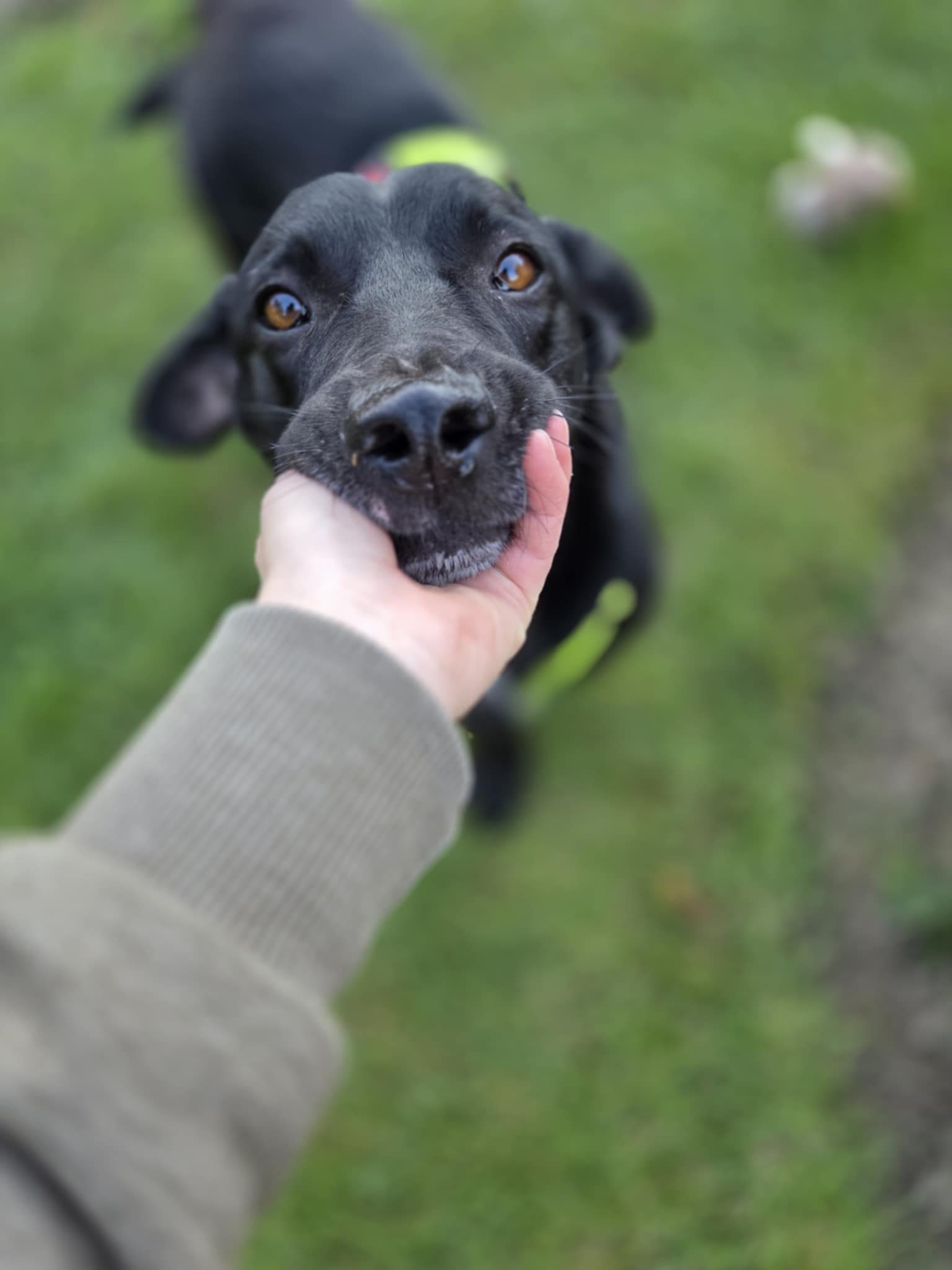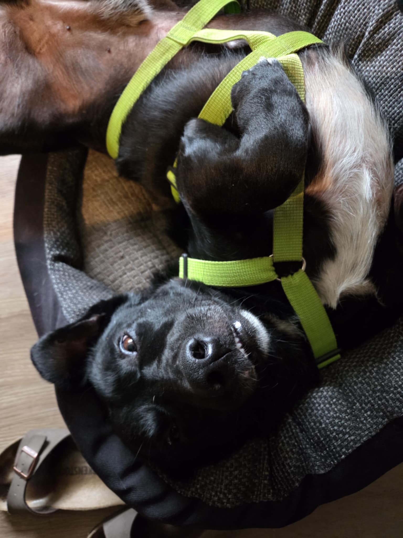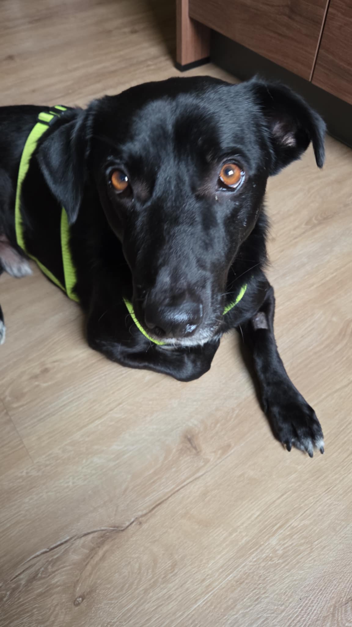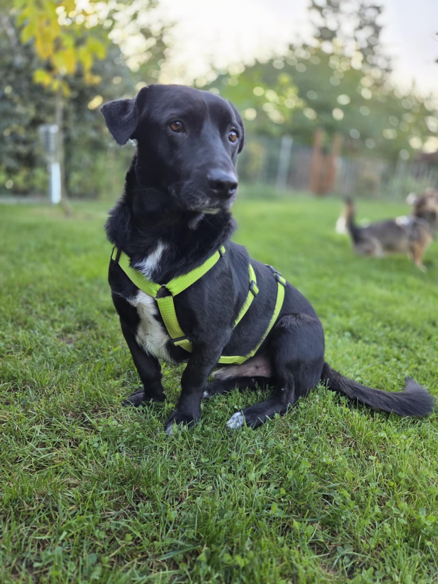 Aller Anfang war schwer…. er braucht ein wenig Zeit, um Vertrauen aufzubauen. Doch mittlerweile kennt er Geschirr, Leine und Maulkorb und lässt sich alles brav anlegen. Er ist stubenrein und zeigt keinerlei Futterneid oder Ressourcenverteidigung o. Ä.