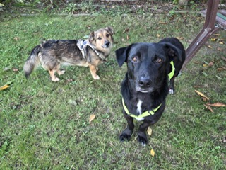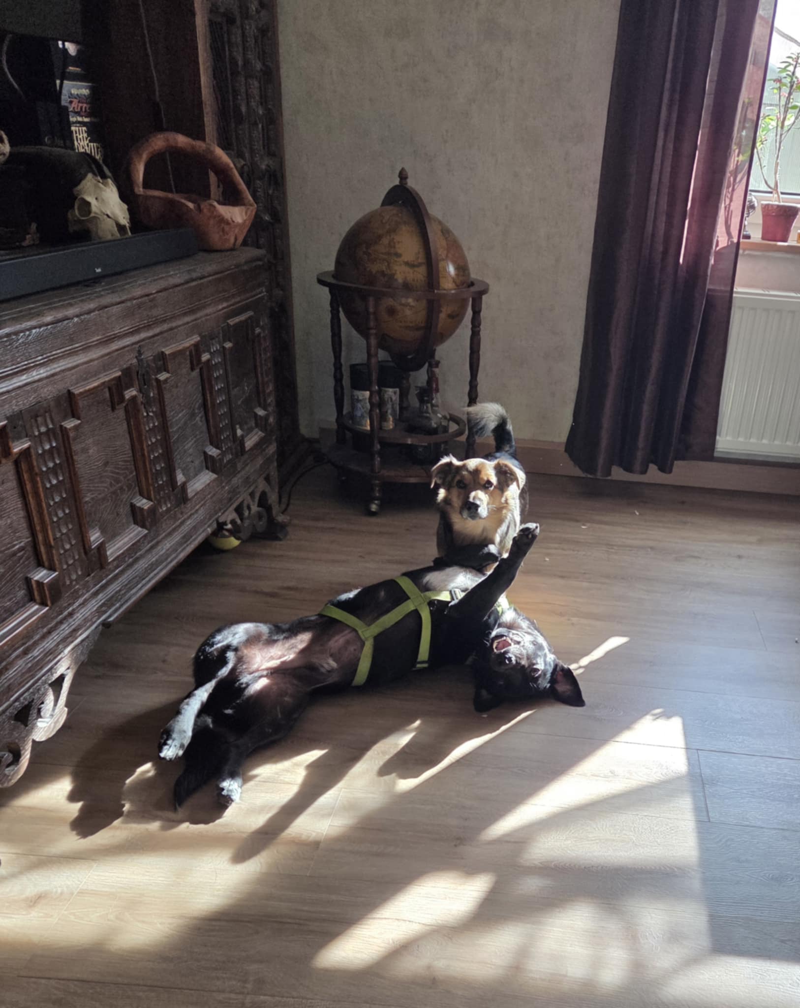 Risus zeigt sich sehr verträglich mit anderen Hunden und nimmt sich hier sogar eher zurück (hier lebt er mit einem weiteren kleineren, kastrierten Rüden zusammen und die Hündin meiner Schwiedermutter ist oft zu Besuch).