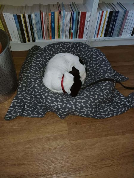 Einmal die Woche begleitet sie ihr Pflegefrauchen ins Büro, wo sie dann brav in ihrem Körbchen liegt, sich mit einem Kauknochen beschäftigt bis sie dann einschläft.