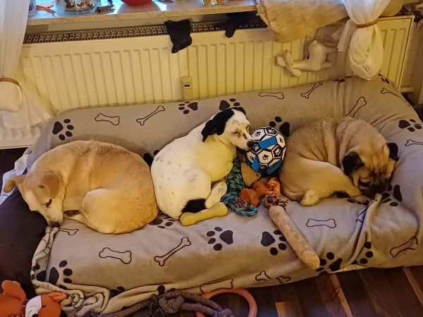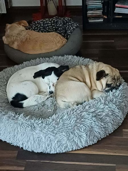 Im Zuhause verhält sie sich ruhig und liegt gerne im gemütlichen Körbchen. In Gesellschaft ihrer Hundekumpel kann sie auch mehrere Stunden ohne Probleme alleine bleiben ohne zu bellen oder etwas kaputt zu machen.