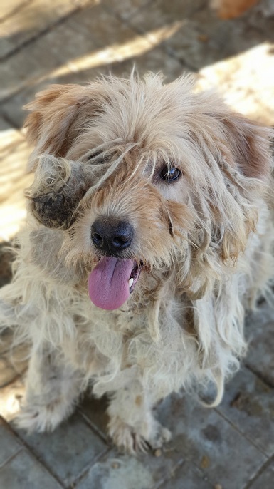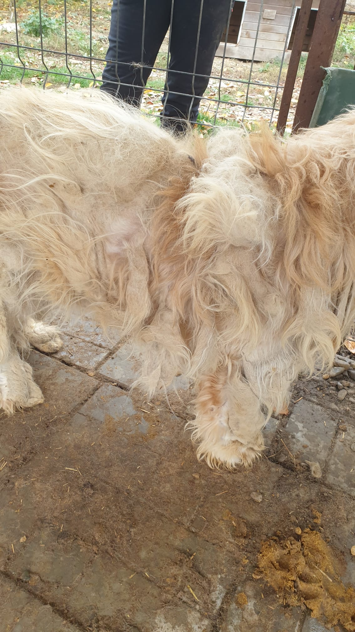 RÜBE sieht schon viel besser aus und sein Fell ist schon gut nachgewachsen. Allerdings ist es nun sehr verfilzt. Leider lebt er aktuell zudem in einem sehr kleinen Kennel.
