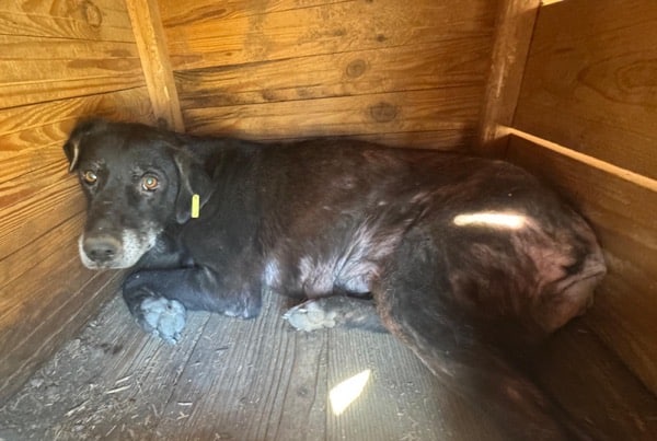 SADDY ist eine unsichere Hündin, die in ihrer Hütte lag und nicht herauskam. Wir vermuten, dass sie mal Welpen hatte. Sie ließ leichte Berührungen zu und nahm auch Leckerlies aus der Hand.
