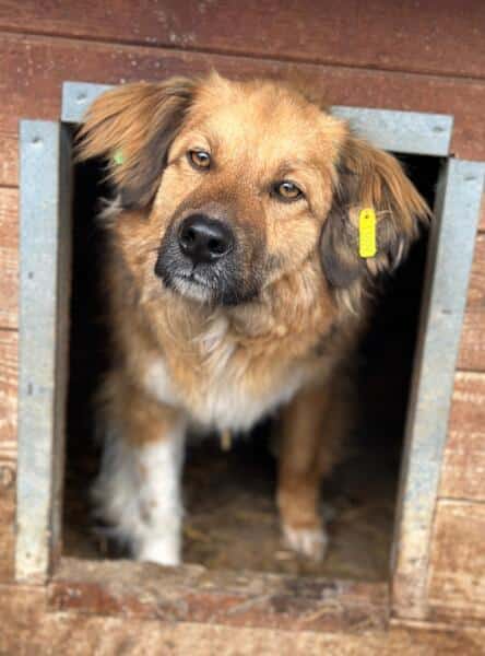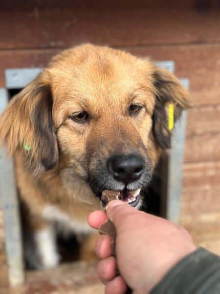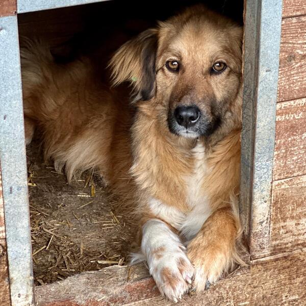 SHAHIN hielt sich zu Beginn unseres Besuchs zurückgezogen in seiner Hütte auf. Doch als wir ihm dort unsere Aufmerksamkeit schenkten, nahm er vorsichtig und gern die Leckerlies aus der Hand und traute sich heraus. Neugierig schnupperte er nach weiteren Leckerlies und nahm sie ebenfalls behutsam entgegen. Dabei konnten wir ihn leicht an der Nase berühren, was für ihn noch ungewohnt zu sein scheint, denn kurz darauf zog er sich wieder in seine Hütte zurück. Unter Bedrängung konnten SHAHIN ihn dort überall anfassen und er blieb stets defensiv. In seinem gemischten Rudel zeigt er sich verträglich und kommt mit den anderen Hunden gut zurecht.
