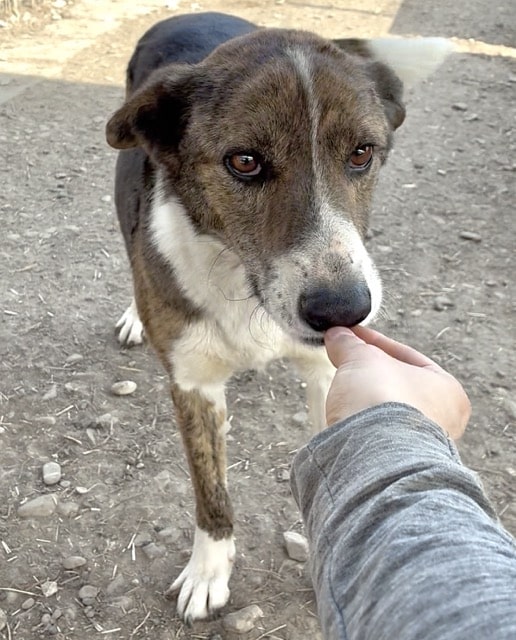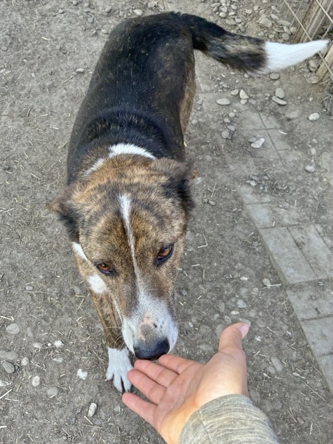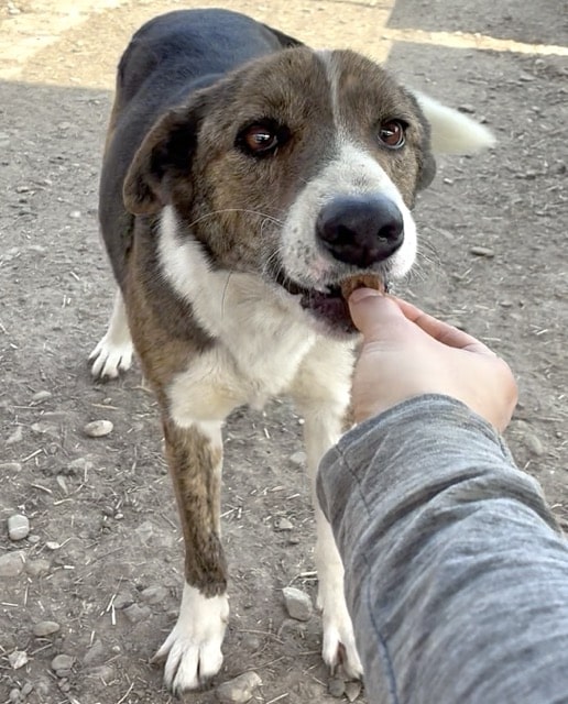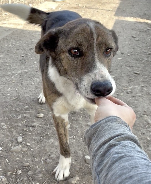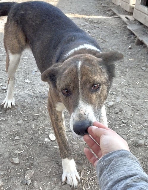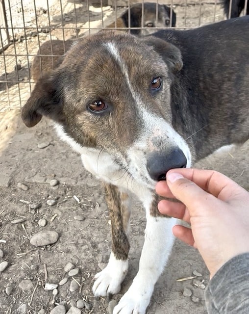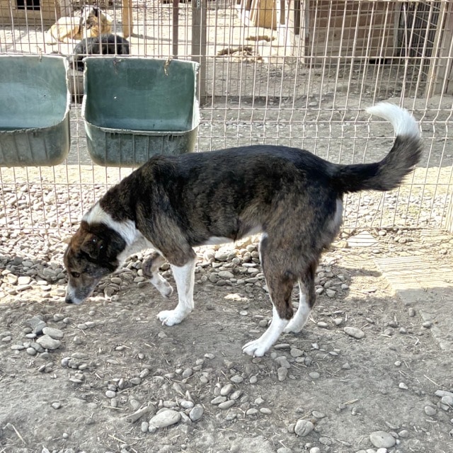Dieser wunderhübsche Rüde zeigte sich sehr verträglich und tollte fröhlich mit seinen Hundefreunden im Kennel umher. Er ist an uns Menschen interessiert und nahm auch schon ganz vorsichtig Leckerlies von uns – zum Anfassen hat sein Mut aber noch nicht gereicht. Er war aber zu keiner Zeit panisch uns gegenüber. Da er sich stark an anderen Hunden orientiert, würden wir ihm in seinem neuen Zuhause einen souveränen Ersthund wünschen, an dem er sich orientieren kann.