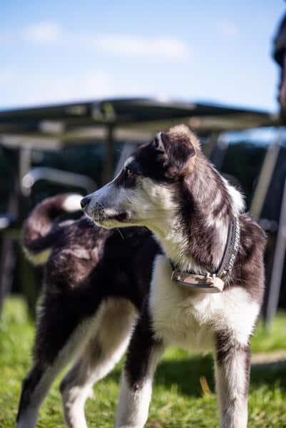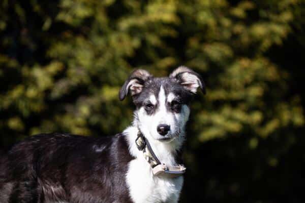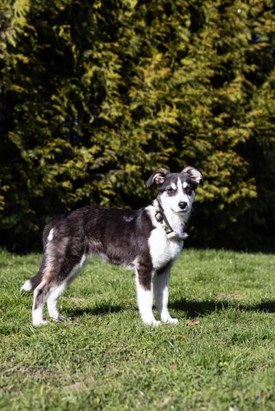 mittellanges Flauschfell schwarz weiß, ausdrucksvolle Maske, Stehkippöhrchen und die lange Rute im lustigen Bogen getragen