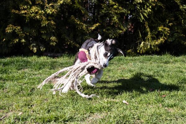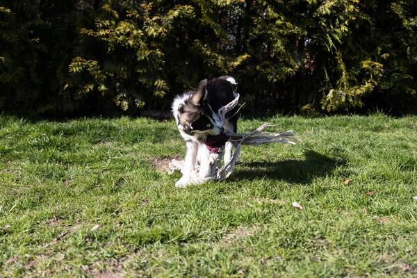 Inzwischen ist die Schonphase vorbei und Silva mag gerne dabei sein. Dann kann sie auch ein kleiner frecher Wirbelwind sein, der gerne umherhopst, gerne spielt und tollt und läuft, was die langen Beine hergeben. Gerne mit Artgenossen, gerne mit dem Pflegefrauchen, aber auch mal für sich ganz alleine. Dann wirft sie ihr Bällchen hoch oder zergelt mit dem Tau. Sie beginnt zu apportieren; läuft mit dem Spieli in Richtung Mensch und lässt es sich gut und gerne abnehmen, um eine neue Runde zu drehen. Und wenn die Draußen-Zeit vorbei ist, findet Silva im Haus auch sehr gut wieder zur Ruhe. Home Office ist ebenfalls unkompliziert möglich.