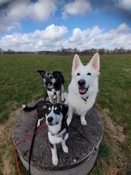 Silva fährt gerne und völlig entspannt im Auto mit. Sie steigt alleine ein, legt sich auf ihren Platz und los kann es gehen; ideale Voraussetzungen für Urlaubsreisen, die selbstverständlich gemeinsam erlebt werden. Auch in fremder Urlaubs-Umgebung verhält sie sich, hier zusammen mit dem Hunderudel, einwandfrei. Sie war kürzlich mit auf Seminar und hat sämtliche einhergehende Anforderungen wie z.B. warten im Ferienhaus, warten beim Training, Spaziergang in großer fremder Gruppe, Restaurantbesuch prima gemeistert. Den Strand hätte sie am liebsten jeden Tag genossen. Sie mag alle Menschen. Große, kleine, dicke, dünne, Männer, Frauen und nette, verständige Kinder. Alltagsgeräusche wie Fernseher, Staubsauger, Mixer sind kein Problem. Sie zeigt an, wenn sie raus muss, ist dann stubenrein. Sie schläft nachts durch, macht nichts kaputt, dekoriert nichts um. Sie ist nicht futterneidisch, wartet bis sie ihren Napf bekommt, verhält sich dabei mustergültig den anderen Hunden gegenüber. Ich kann ihr jederzeit Dinge wieder abnehmen, bzw. gibt sie es auf Kommando aus. Sitz‘, Platz‘, und Bleib‘ klappt schon gut, ist im Werden. Der Rückruf sitzt prima; auch unter Ablenkung orientiert sie sich zurück, was ihr bereits eine gewisse Freiheit ermöglicht.