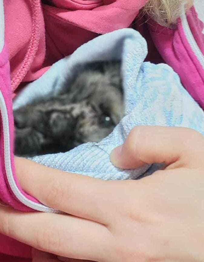 Unser Vet-Team hat sie in dieser schweren Zeit liebevoll umsorgt und wie einen kleinen Burrito in ein Handtuch gewickelt, eng an die Brust gehalten, um ihr Wärme und Sicherheit zu geben.