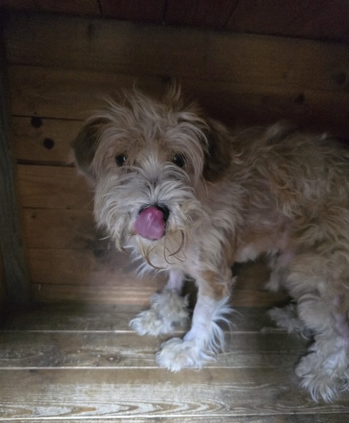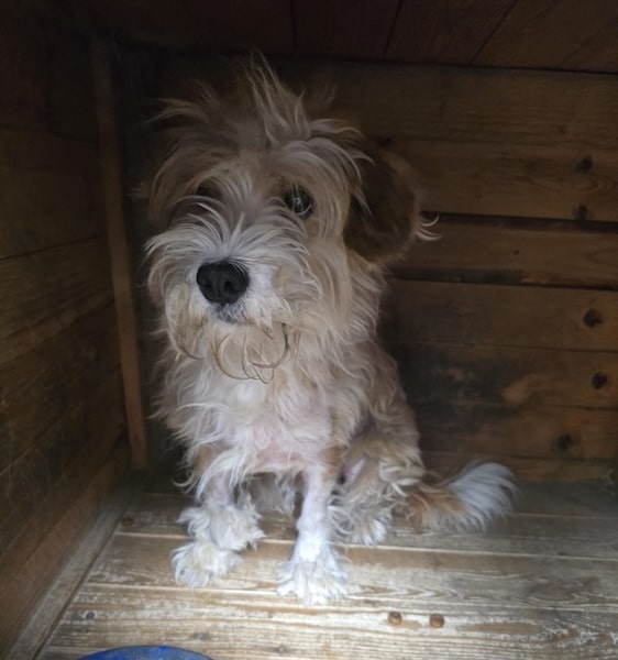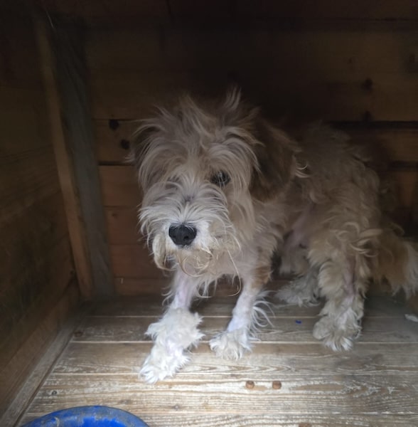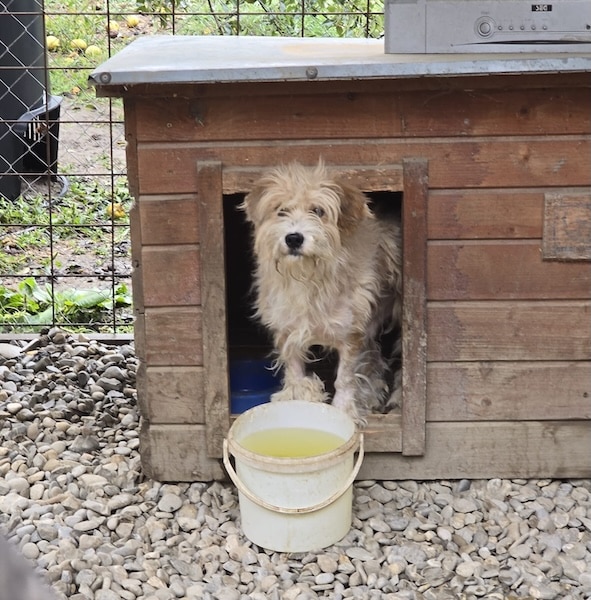 Dieser Rüde lebt zusammen mit größeren Hunden in einem Kennel. Zur Verträglichkeit können wir keine Aussagen machen, denn er war die ganze Zeit, als wir dort waren, in seiner Hütte.
