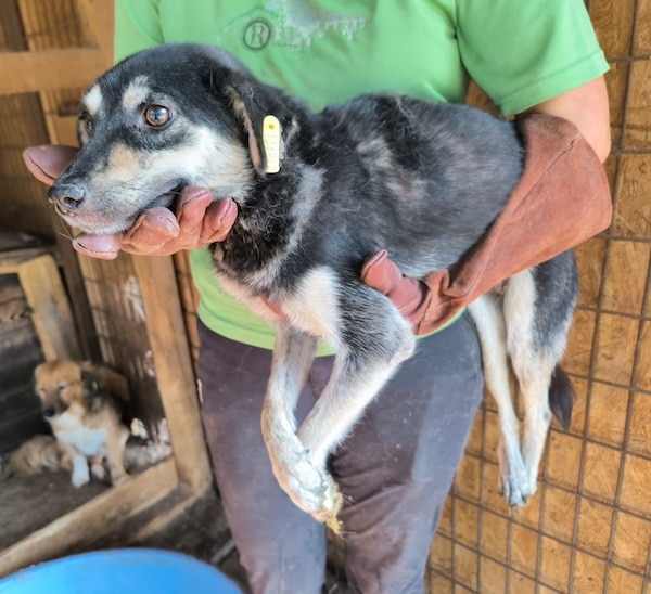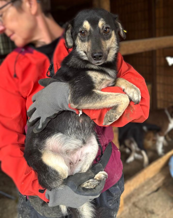 Beim Betreten des Kennels versteckte sie sich in der Hütte. Dort konnten wir sie unter Bedrängung herausheben. Dies ließ sie ohne Abwehrverhalten über sich ergehen.