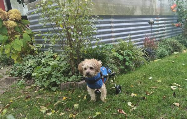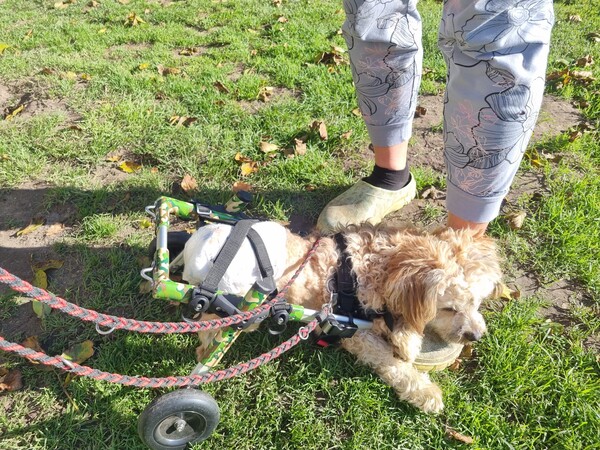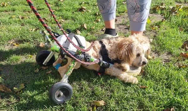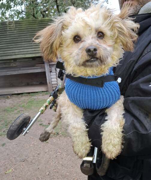 Hier angekommen gab es ein Rolli für ihn…da der kleine Mann nur auf dem Po rutschen konnte und bereits wund davon war. Nach und nach schaffte er es wirklich sich immer mehr aufzustellen und wurde ein Spinal Walker. Ein „Spinal Walker“ ist ein Hund, der nach einer schweren Rückenmarksschädigung (z.B. Bandscheibenvorfall) die Hinterbeine nicht mehr bewusst steuern kann, aber durch Rückenmarksreflexe wieder laufen lernt. Diese unbewusste Fortbewegung ist oft unkoordiniert, ermöglicht jedoch Lebensfreude trotz Handicap. Und Lebensfreude pur sprudelt aus ihm…er liebt sein Leben und den Menschen…Körperkontakt ist das Größte für ihn.