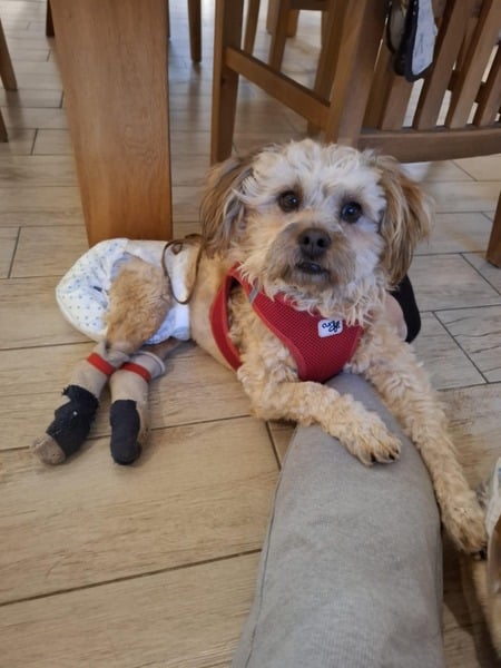 Hauptsache er darf überall dabei sein. Leider hat er kein Stellreflex in den Hinterfüßen mehr und muss diese täglich und dauerhaft verbunden bekommen damit er sie nicht wund läuft, das geht bei dem quirligen Kerlchen sonst ruck zuck. Zu gern manipuliert er daran rum und wir sind oft damit beschäftigt es zu erneuern…uns auf Trab halten kann er perfekt. Er möchte gern Bäume ausreißen.