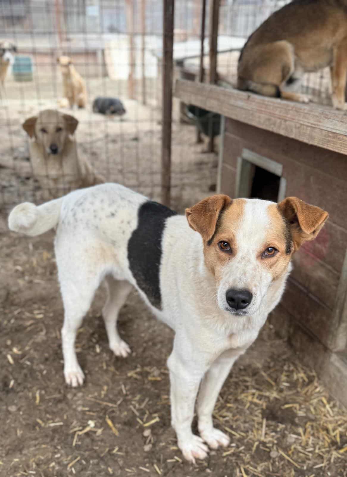 TIBBO ist ein junger Rüde, der leider viel zu dünn ist. Er wird in seinem Kennel gemobbt und nicht ans Futter gelassen. Zunächst saß er nur in der Hütte und nahm unsere Leckerlies gerne an. Obwohl er unsicher ist, konnten wir ihn dort nach kurzer Zeit auch am Kopf streicheln, auch wenn er sich dabei noch sehr unwohl gefühlt hat.