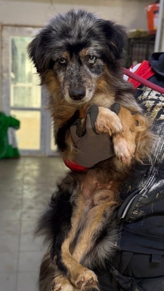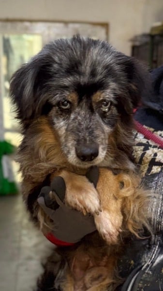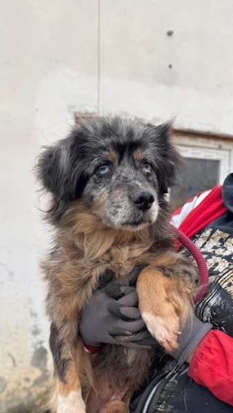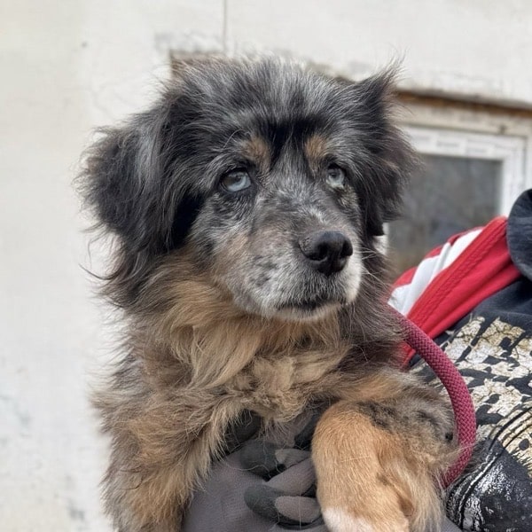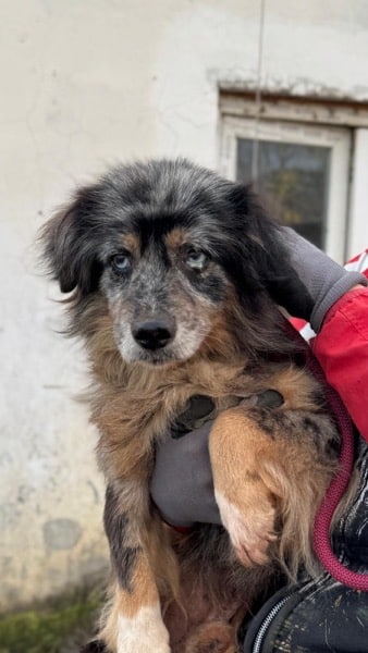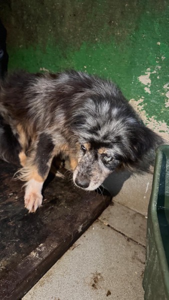 Timba ist ein kleiner Rüde, der auf seine alten Tage das Pech hatte, in Bucov zu landen. Hier sitzt er jetzt im dunklen Vetkennel und vegetiert vor sich hin. Er lag zunächst teilnahmslos in der Ecke, wo er sich gut von uns streicheln ließ. Als wir ihn hochgehoben haben, hat er zunächst abgeschnappt, sich aber schnell beruhigt. Wir konnten ihn dann gut anfassen und streicheln – er scheint es nur einfach nicht zu kennen. Mit seiner Australian-Sheperd-Optik und seinen blauen Augen sieht er wirklich besonders aus. Mit den anderen Hunden zeigte er sich verträglich. Wir hoffen sehr, dass Timba bald einen Platz findet, damit er nicht in einen Außenkennel umziehen muss.