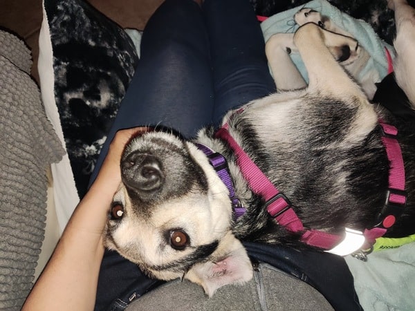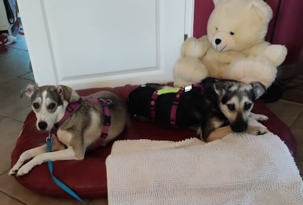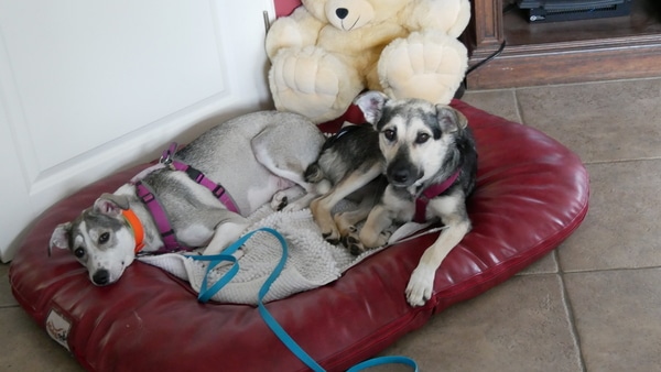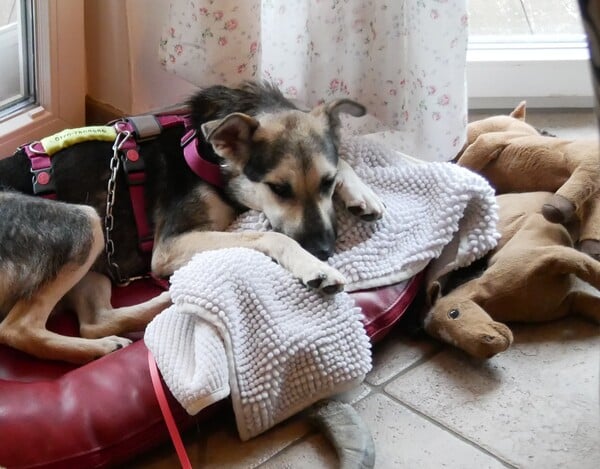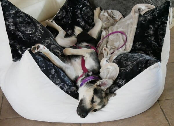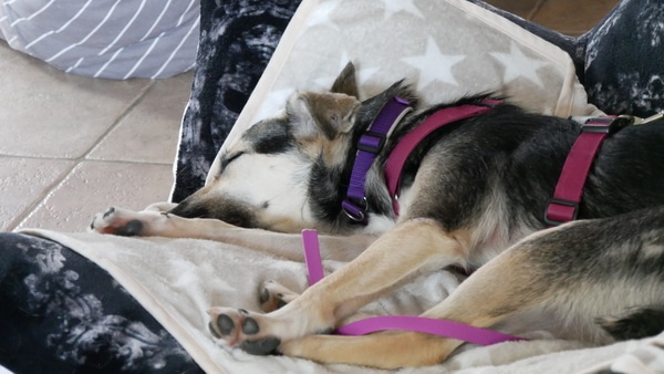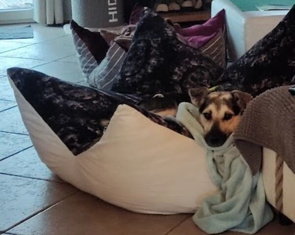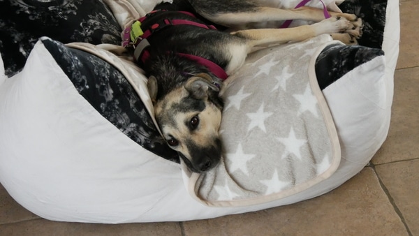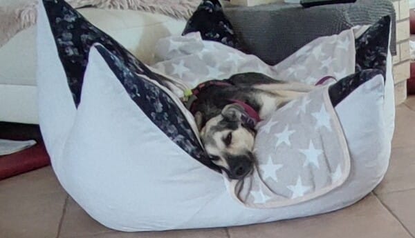 Im Haus ist sie eine ruhige Begleiterin; artig liegt sie in ihrem Körbchen, ist ruhig im Home Office oder Büro. Eine kleine Eigenart von ihr: sie hortet Stofftiere, Spielzeuge und Schuhe; je mehr desto besser, dann schläft es sich so richtig gut. Freundlicherweise sammelt sie nur und macht sie nicht kaputt. Sie bettelt nicht beim Essen und ist selber auch nicht futterneidisch. Ich kann ihr jederzeit Dinge wieder abnehmen. Beim Autofahren das Einsteigen fällt ihr noch schwer, aber mitfahren selber verträgt sie gut, ist ruhig und legt sich ab. Spazierengehen liegt ihr im Blut; natürlich ist alles auch spannend, aber sie geht vorbildlich an der Leine, zieht nicht, hält den Radius gut ein; fast als wenn sie es schon kennt. Hundebegegnungen werden vorsichtig und ruhig gemeistert; schön, wenn wir gemeinsam dann weitergehen. Bett und Sofa sind hier tabu, das wird von ihr akzeptiert. Gekuschelt wird dennoch auf unserem extra dafür bereitgestellten BodenKronenKissen; auch bei Tirana ein absolutes Muss.