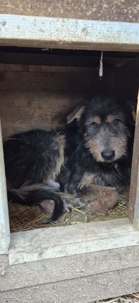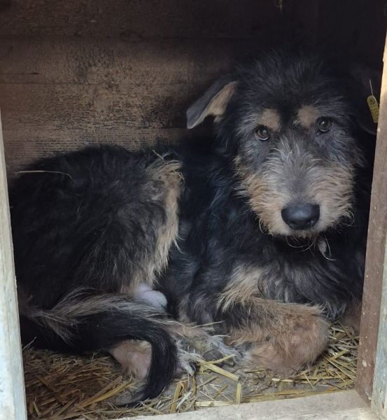 Diesen Rüden haben wir in seiner Hütte liegend vorgefunden. Als wir ihn dazu brachten diese zu verlassen, konnten wir erkennen dass er offensichtlich ein Problem oder Schmerzen an seinem rechten Hinterbein hat. Außerdem konnten wir beginnende Hautprobleme an seinen Ohren feststellen. Die kalte, nasse und schmutzige Umgebung begünstigt das leider sehr, weswegen es gut wäre wenn er zeitnah ausreisen könnte um eine Verschlechterung der Haut zu vermeiden. Anfassen lassen wollte er sich noch nicht, Leckerchen hat er noch nicht direkt aus der Hand aber gern vom Boden genommen.