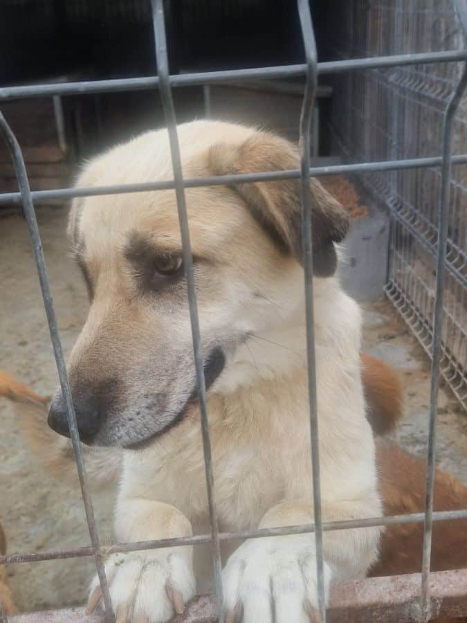 Er hat deutlich abgebaut, hat Narben im Gesicht und einen verletzten Vorderlauf. In seinem jetzigen Kennel geht es ihm besser, aber er ist deutlich verändert. Traurig, müde, kraftlos.