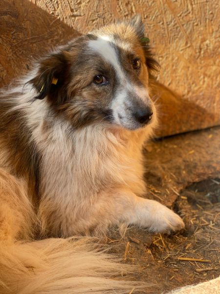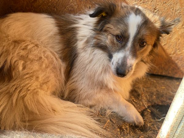 Vassilo hat seine Hautprobleme inzwischen gut überstanden, sein Fell hat sich erholt. Er zeigt sich weiterhin zurückhaltend, nimmt keine Leckerchen aus der Hand und hält lieber Abstand. In der Hütte ließ er sich vorsichtig streicheln, blieb dabei aber noch unsicher. Er braucht ruhige, geduldige Menschen, die ihm Zeit geben, Vertrauen zu fassen.