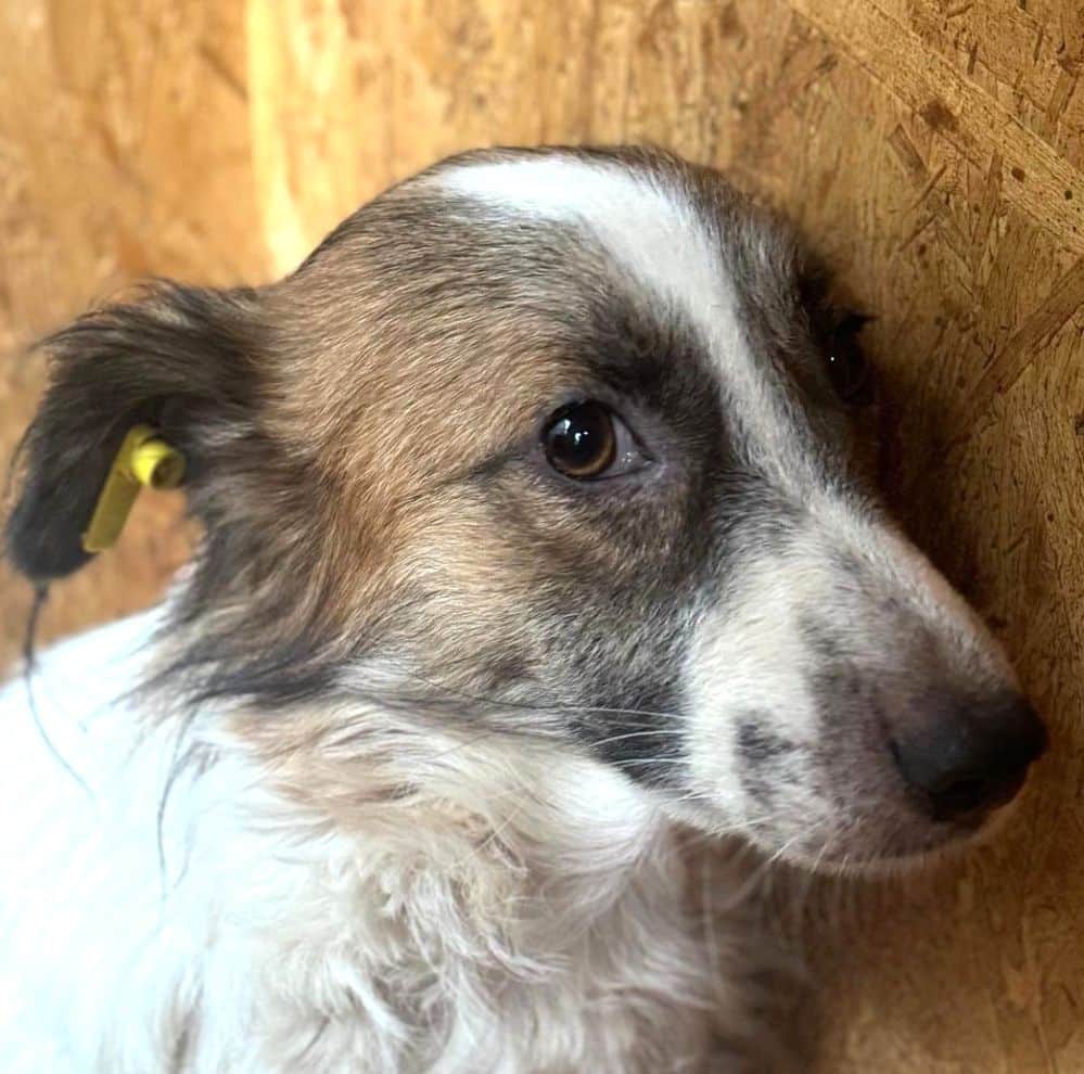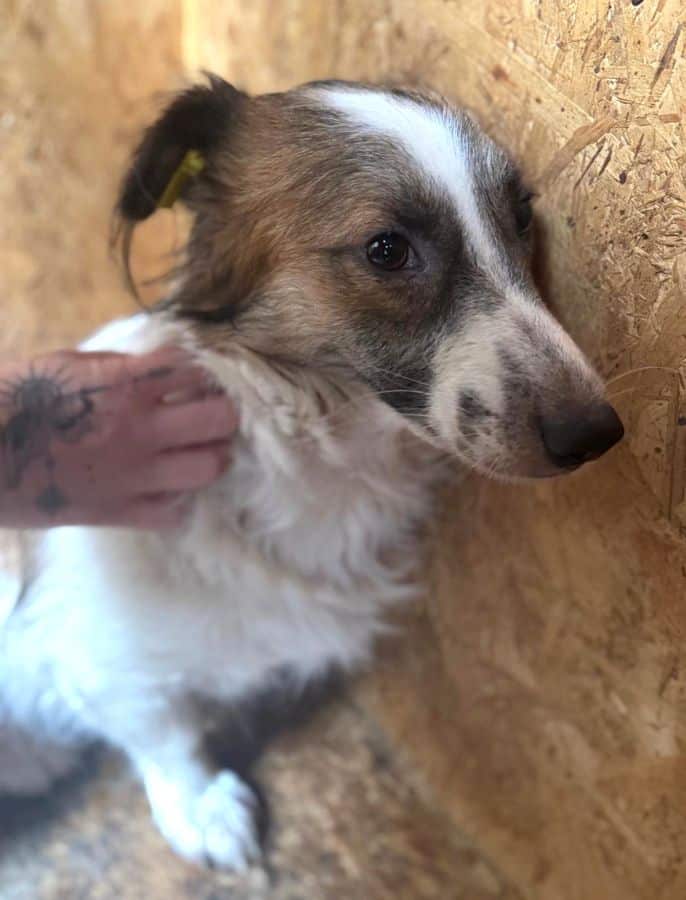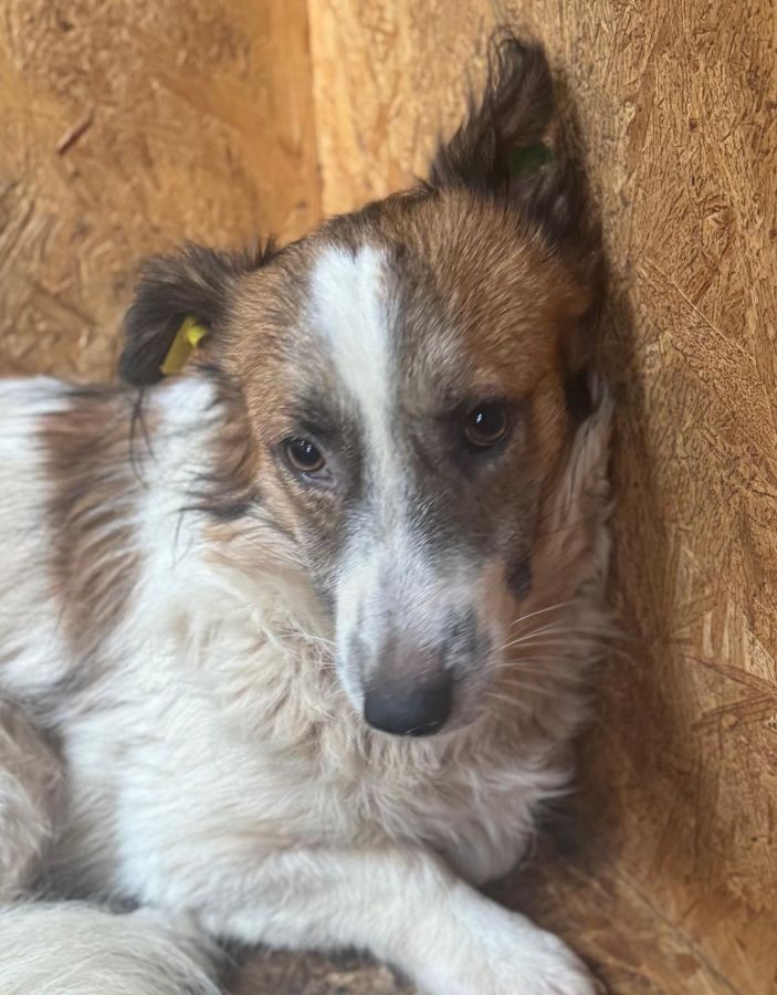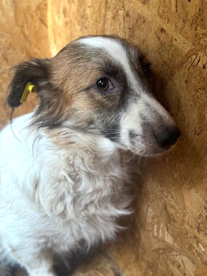 Der kleine VASSILO ist ganz neu im Shelter und wirkt derzeit noch ziemlich überfordert. In der Hütte konnten wir ihn vorsichtig anfassen und er blieb zu jeder Zeit absolut defensiv, genießen konnte er es jedoch noch nicht. Auch mit Leckerchen konnten wir ihn nicht locken – in unserer Anwesenheit wollte er nicht fressen. Er lebt in einem gemischten Rudel und zeigt sich dort verträglich.