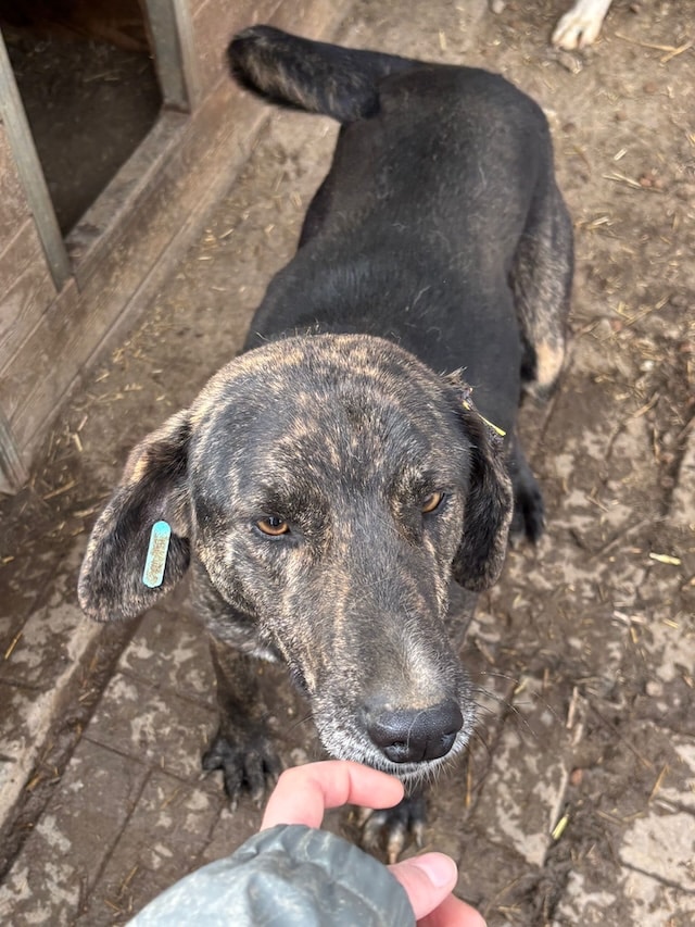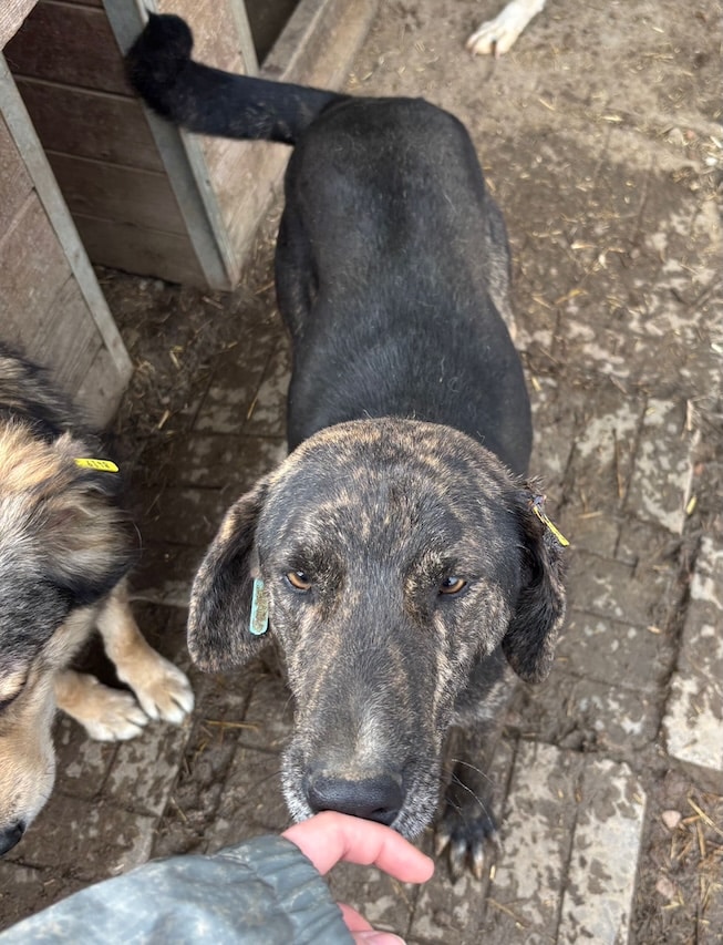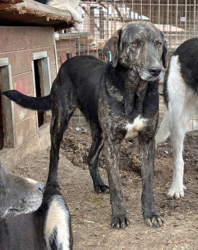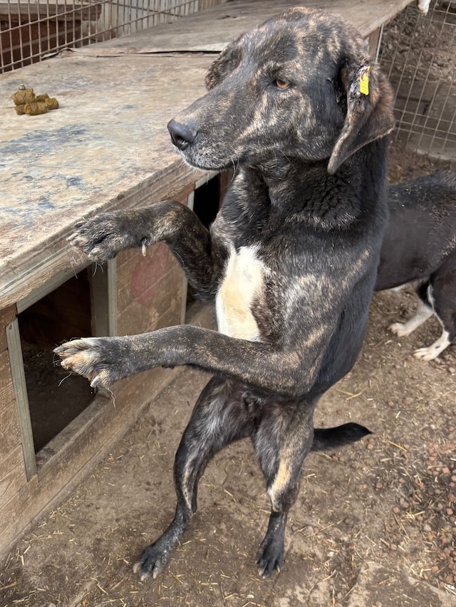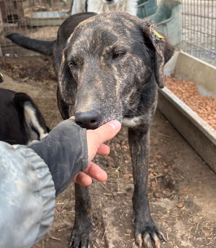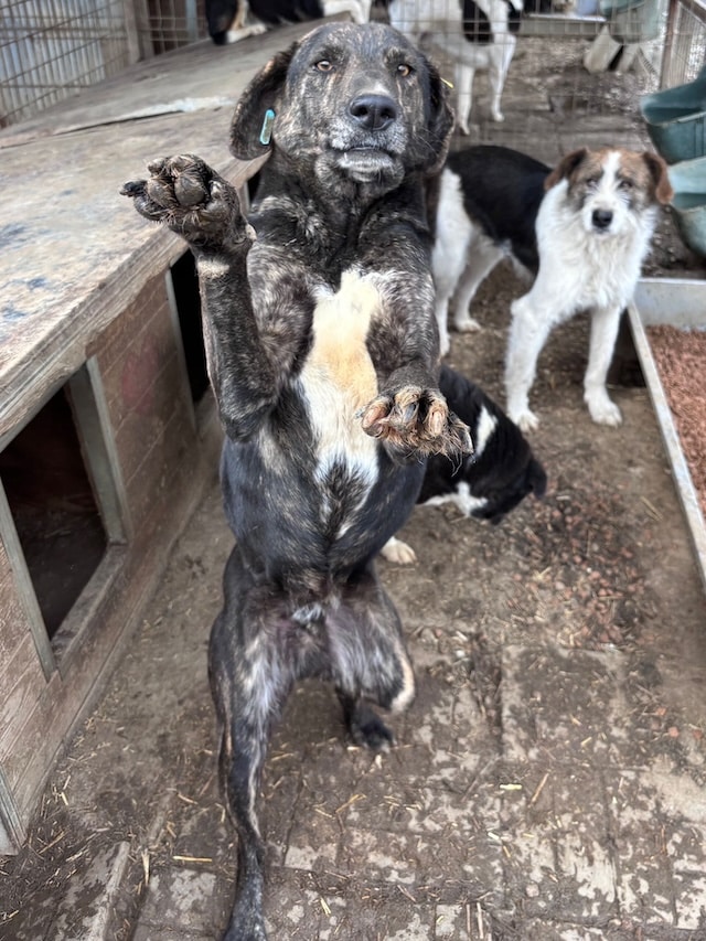 Der gestromte Rüde wurde sichtlich von unserer Anwesenheit beeindruckt, da er selten von Menschen besucht wird – mit Ausnahme der Arbeiter. Neugierig liegt er entspannt in unserer Nähe, zeigt jedoch bei Berührungen deutliches Fluchtverhalten. Sein Charakter ist freundlich, aber gleichzeitig auch etwas unsicher. Er benötigt unbedingt positiven menschlichen Input.